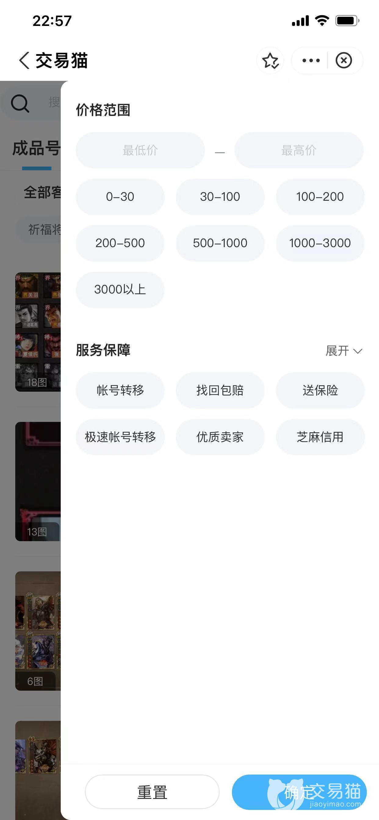 在交易猫中,用户在搜索栏中输入游戏名称后,就可以对多种账号进行筛选了,价格的范围与服务保障都可以选择,还有多种账号类型可以选择,这样能够精准定位到买家想要的账号,让成交率大大提高,也能减少很多买家的时间,更加的方便快捷。