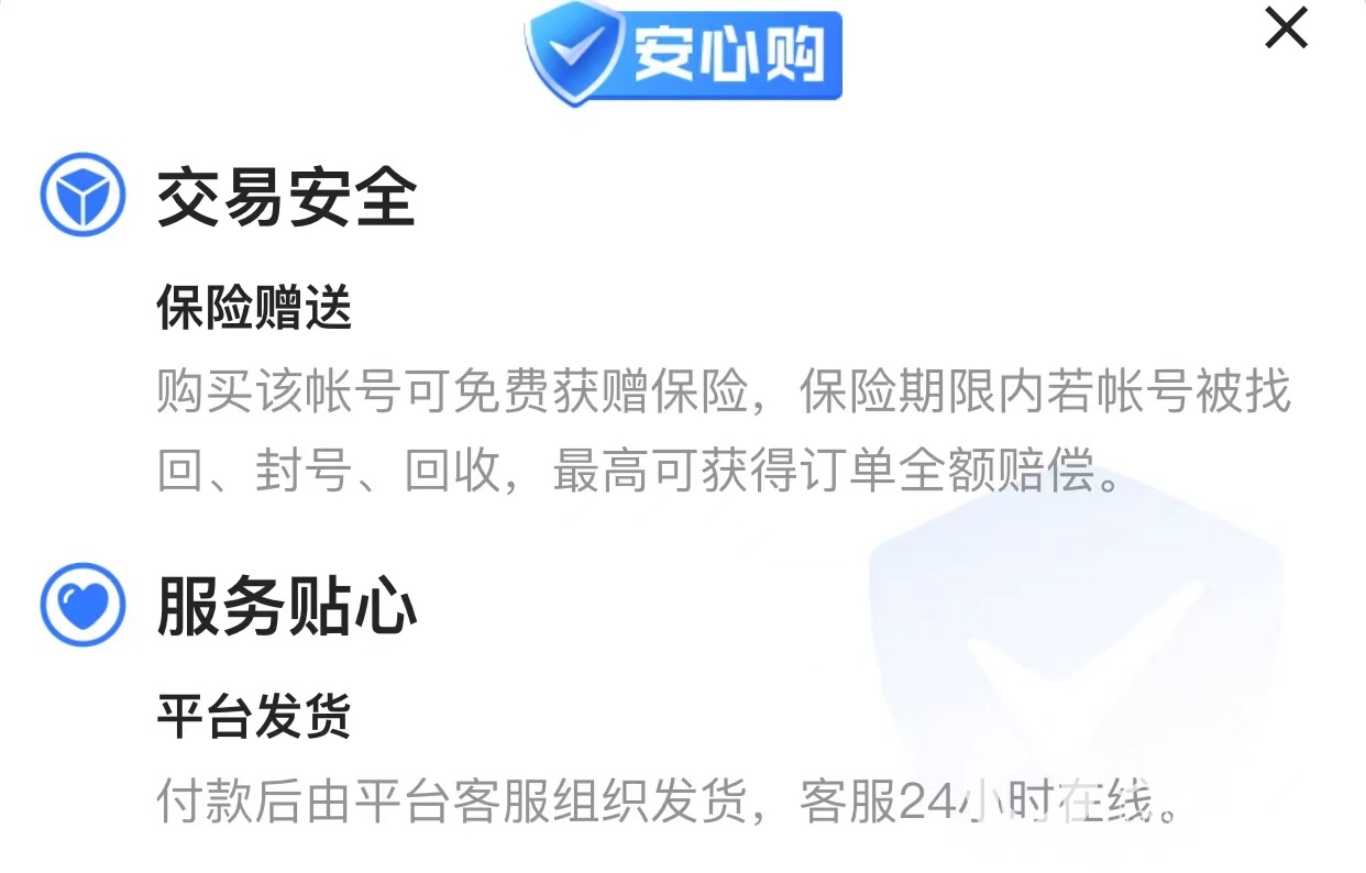 交易猫里部分账号提供安心购的服务,如上图所示,购买这款账号后买家就能免费获得保险,只要在保险期内发生账号被找回、封号、回收这些问题,那么买家就可以直接联系官方平台客服进行反馈,最高还可以获得订单的全额赔偿。而且官方平台发货更加安全,有24小时全天在线的官方客服随时为买卖双方服务。