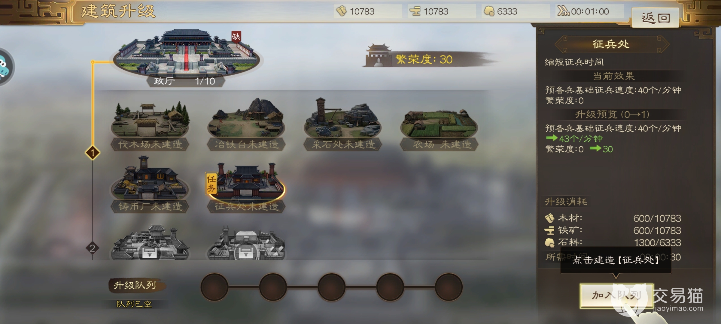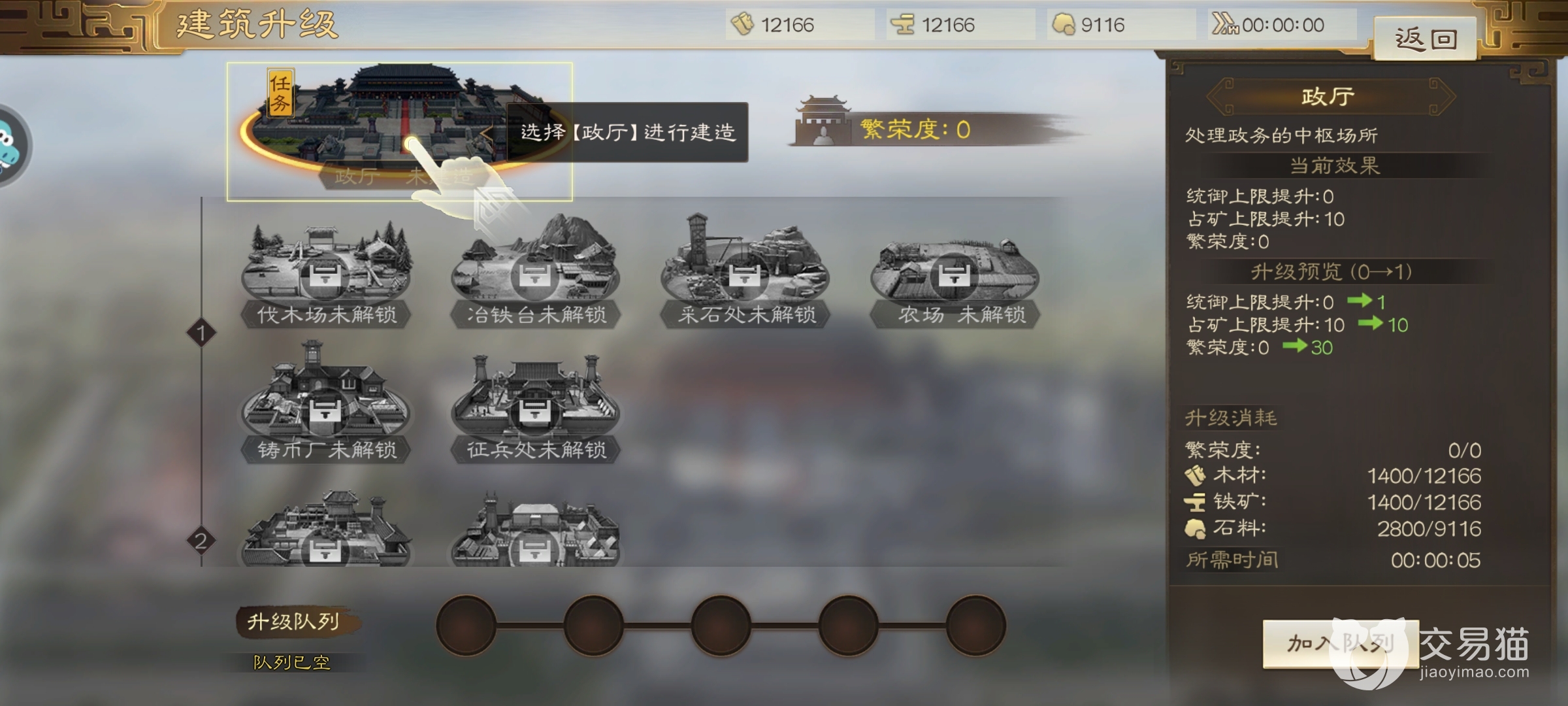 点击修建之后等待几分钟就会完成这个建筑了,这个设施就是玩家处理政务的主要场所,这个设施修建完全之后玩家就可以着手其他建筑的修建了,什么木材厂,炼铁场还有采石场等等都是玩家需要优先修筑的设施,这些设施会产出能让建筑升级的材料。