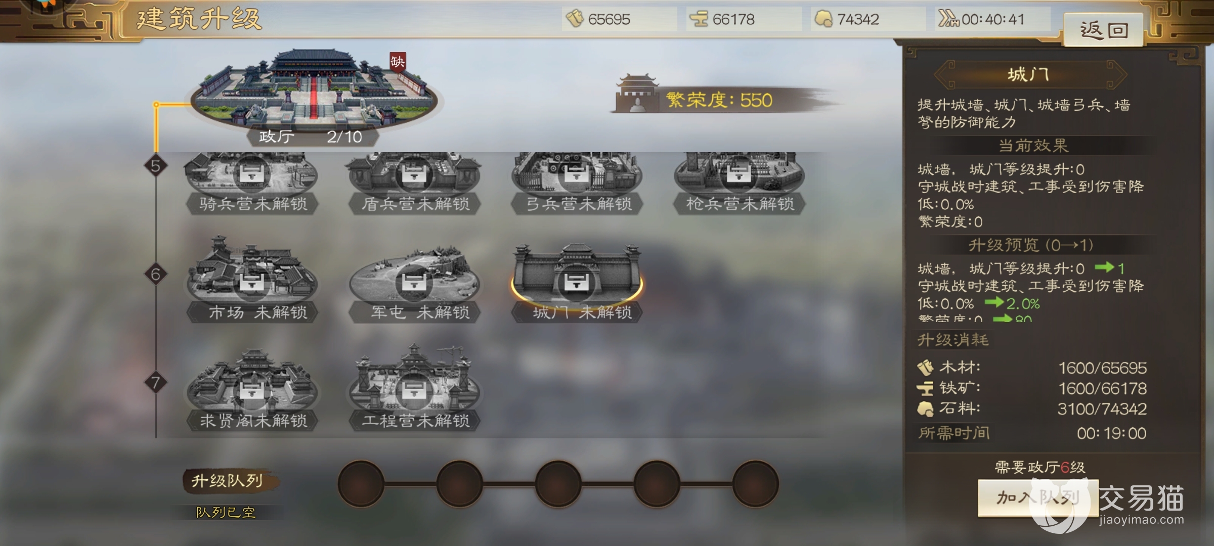 以上就是全部的介绍了,毕竟玩家要到政厅六才有可能修建这个建筑,所以前面不用太担心城防问题,如果地区足够和平,城门的修建可以放在最后,之后为了繁荣度稍微修建一些等级最好。