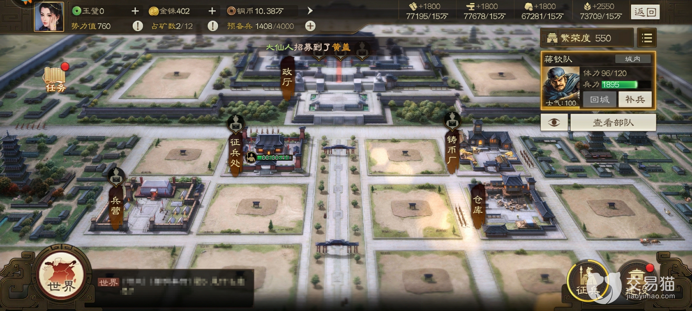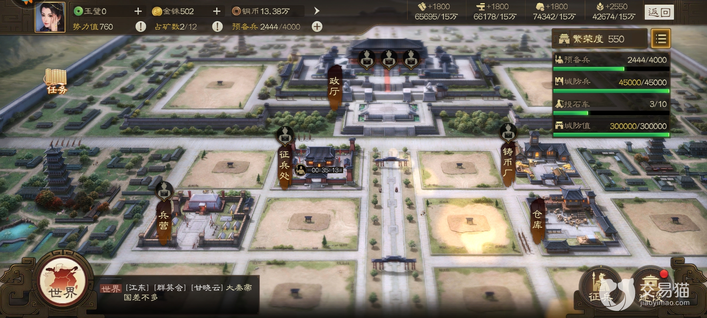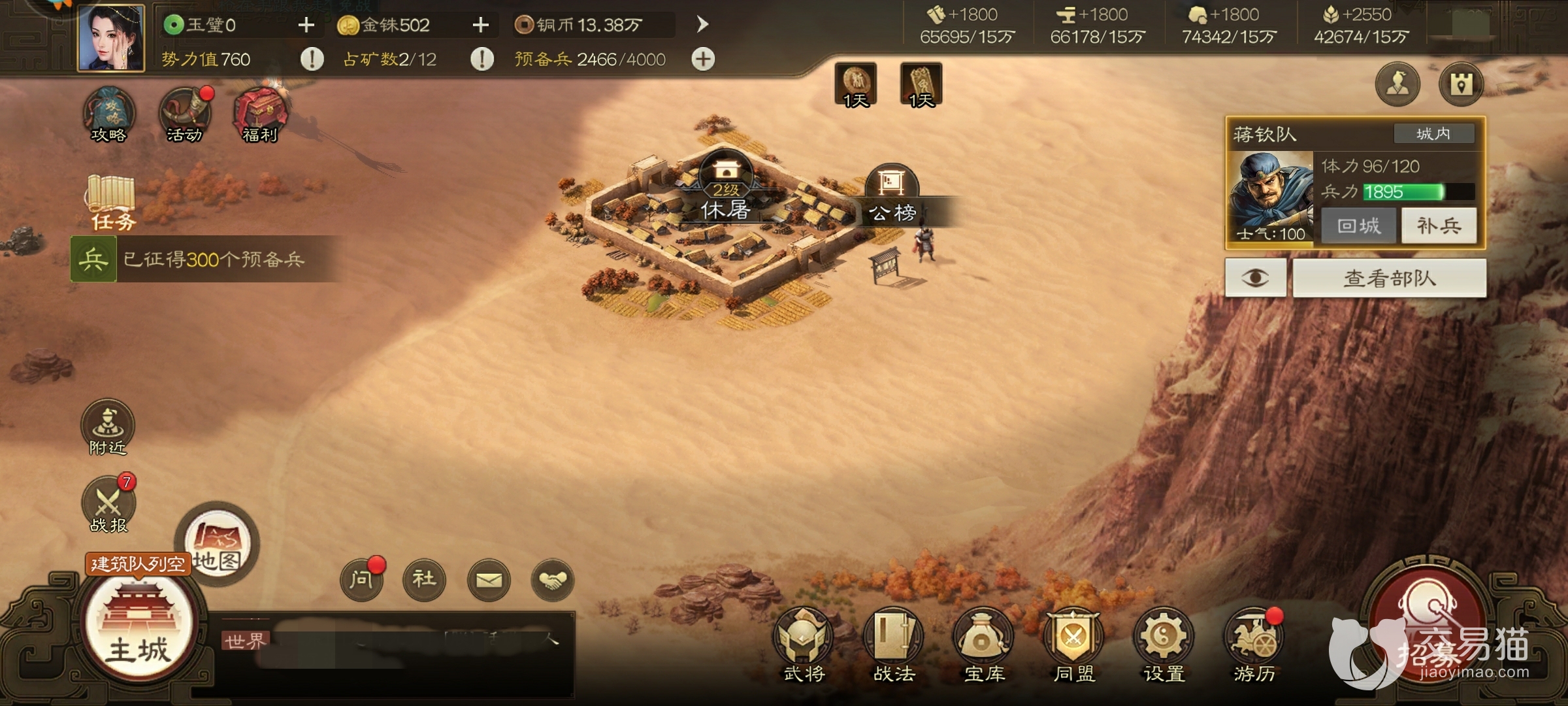 玩家在主城的繁荣度的界面可以看到自己的兵力部署以及城防值,这些是为了保护玩家的城池而设立的系统,城防越高越能保护玩家不受到其他玩家的侵扰,修建完成城门之后可以提升城墙、城门、城墙弓兵、墙弩的防御能力。
