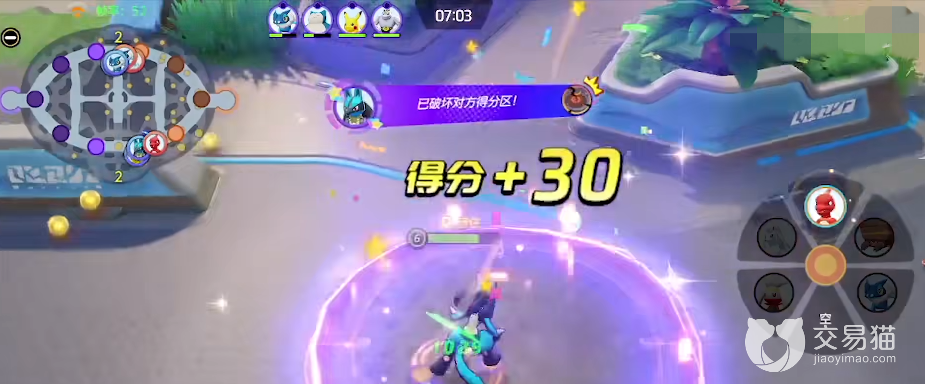 游戏的玩法并不是5v5的pk守塔,而是在地图上战斗争抢资源,然后去敌方的篮筐投篮得分。游戏地图上有很多的宝可梦野怪,玩家击杀他们之后会掉落经验,前期的玩家都很弱小,需要不断击杀这些野怪才能快速升级。游戏当中有三条路线可以选择,最后将得分最多的一家可以获取胜利,很多时候只要守住自己家的据点就能翻盘胜利,当然玩家的宝可梦越熟练,越能快速击杀敌方守卫据点的玩家。玩家击杀中间出现的各种神兽宝可梦,还能获取很多的分数经验,并且可以为集结技能快速充能,争抢神兽是游戏当中最让人激动的一个环节,往往可以左右游戏的战局走向,当玩家处在劣势的时候去击败神兽可以让玩家逆风翻盘,拿下更多的据点。玩家在据点是可以回复生命的,也是一个拉扯的小技巧。