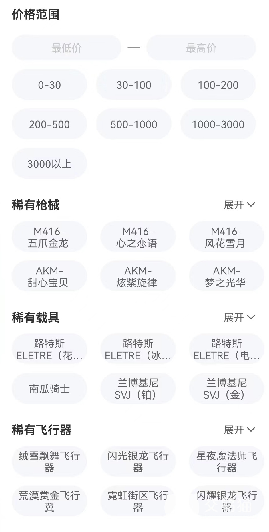在和平精英中拥有数量非常多的皮肤涵盖了各个类型,如果逐个账号去查看那将消耗大量的时间也不切实记。在交易猫平台的和平精英出售专区里,可以通过精准的筛选服务来寻找自己需要的内容。因为账号中的皮肤是和价值最相关的道具,所以在筛选中将稀有枪械,稀有载具和稀有飞行器逐个展现了出来,通过点击选择的方式就能进行筛选,选择完毕后,所呈现在眼前的就是所有符合要求的内容。如果对其他方面没有要求,那就直接通过价格排序将最便宜的找出来,就是符合要求的那一款。
