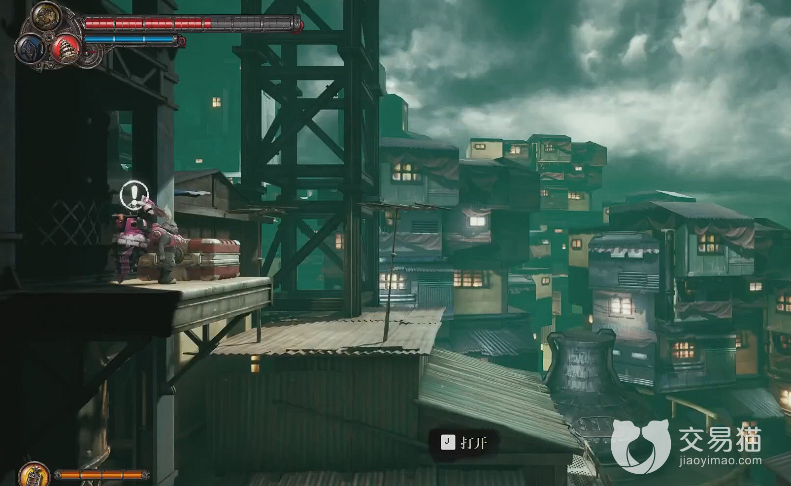 在旧城区有两个,第一个如图所示,在图片兔子标记的地方。我们与武师傅谈话之后,直接向前走,在出去来到兴诚典当这个招牌的时候向上跳,便可以来到红色保险门前,进去直走,坐电梯上去就能找到。