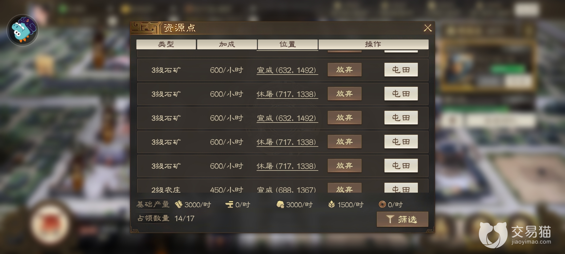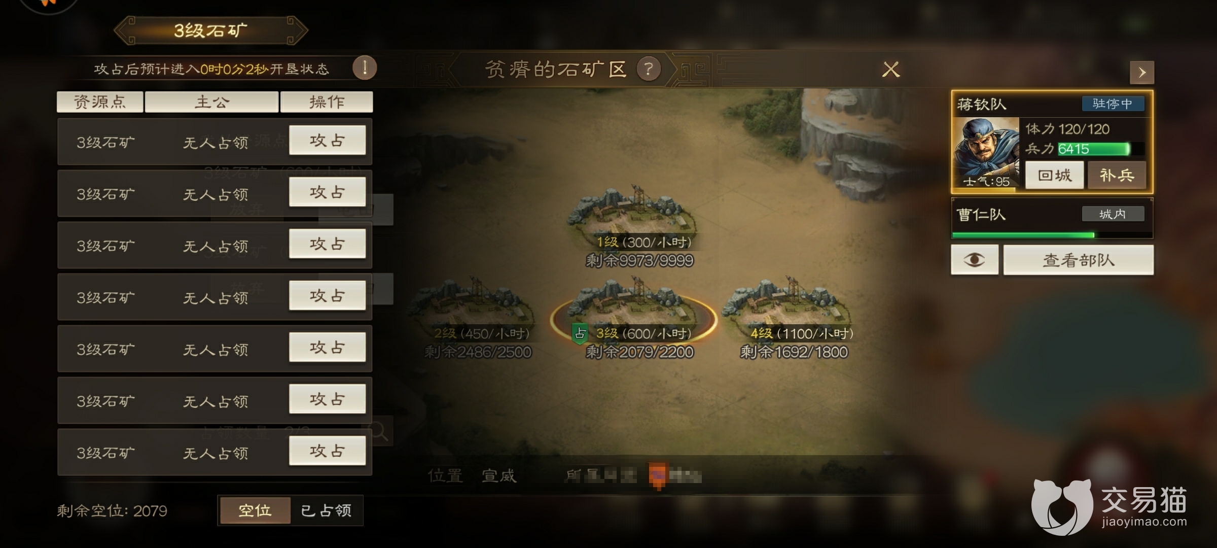 当然光修建建筑不会增加产量,玩家需要占领石矿场才能发挥建筑的加成,也就是在野外击败山贼就能让玩家占领领地,还能获得扩疆奖励,当然也有上限,需要玩家升级自己的城市,这样就能增加占领的数量了。