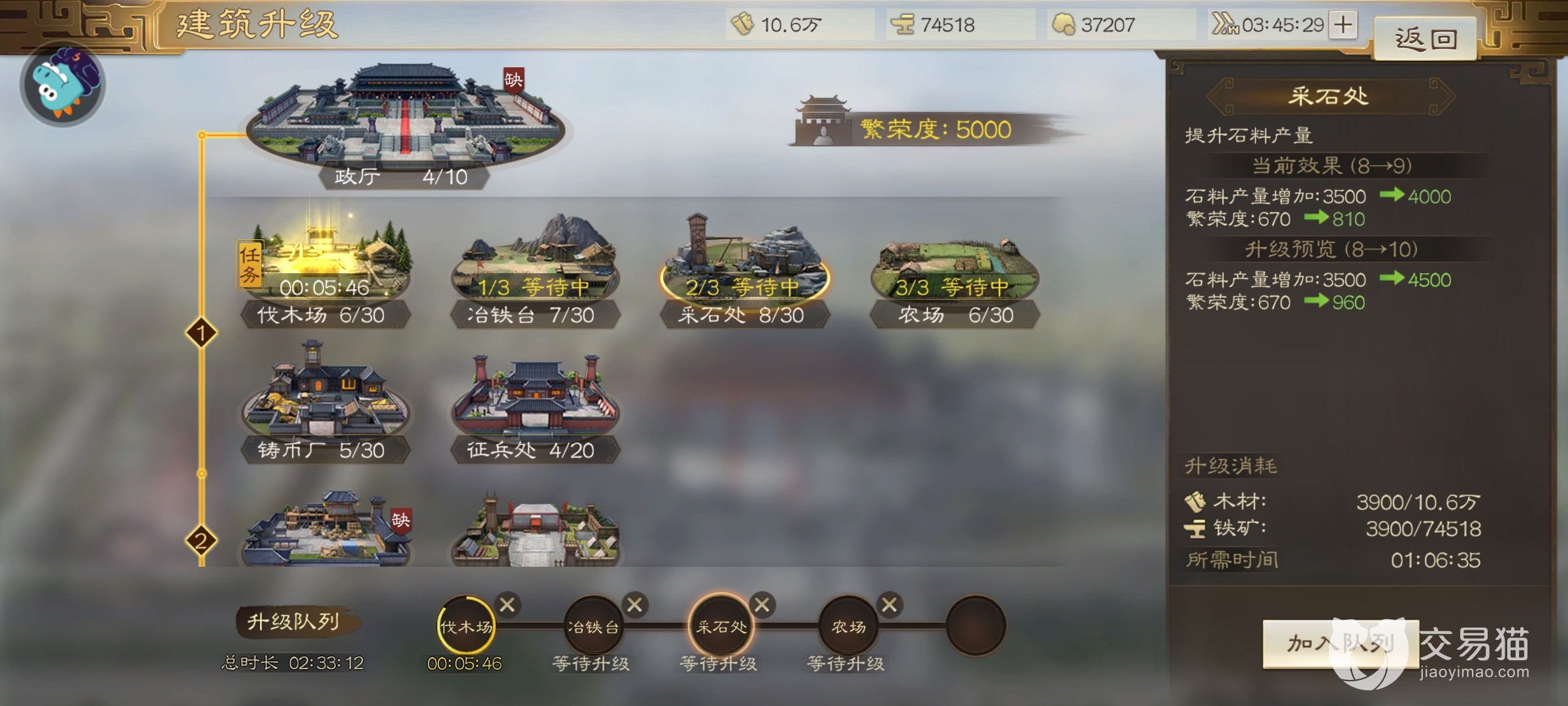 主要的作用就是提升玩家的石料的产量,石头在前期是所有材料当中最为紧缺的物资,因为政厅这个设施升级需要大量的石头,基本上几十万的量都不够塞牙缝,所以玩家升级采石处,提升产出比,就显得异常的重要。