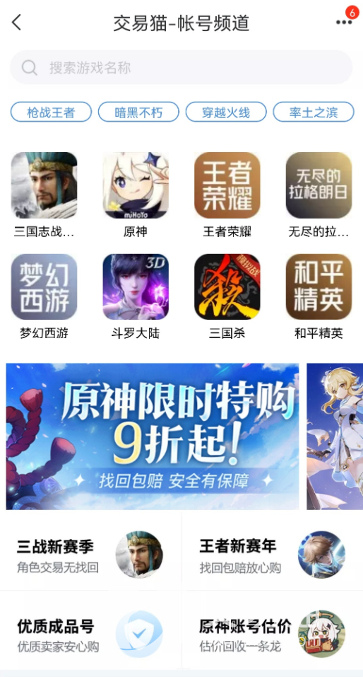 小伙伴们除了王者荣耀还想入坑其他游戏的话,也可以在交易猫内进行账号的交易,平台有包含王者荣耀、和平精英,原神等一万多种热门游戏可供选择,账号多多选择多多哦。