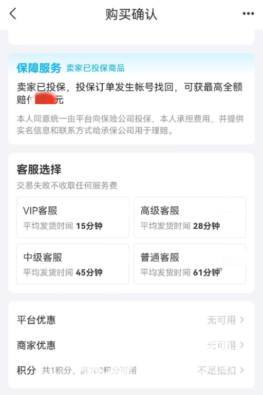 在说一点,交易猫平台是非常安全的,这么多年来几乎没有出现过交易事故,这无疑是因为交易猫先进的安全系统,这一点在游戏账号交易上尤为的明显,在游戏账号交易上平台会给到一份保险,这份保险的作用可以在交易结束以后对部分购买保险的账号进行保护,在保险期间遇到账号问题可以利用这个保险寻求平台帮助,平台会帮忙解决问题。