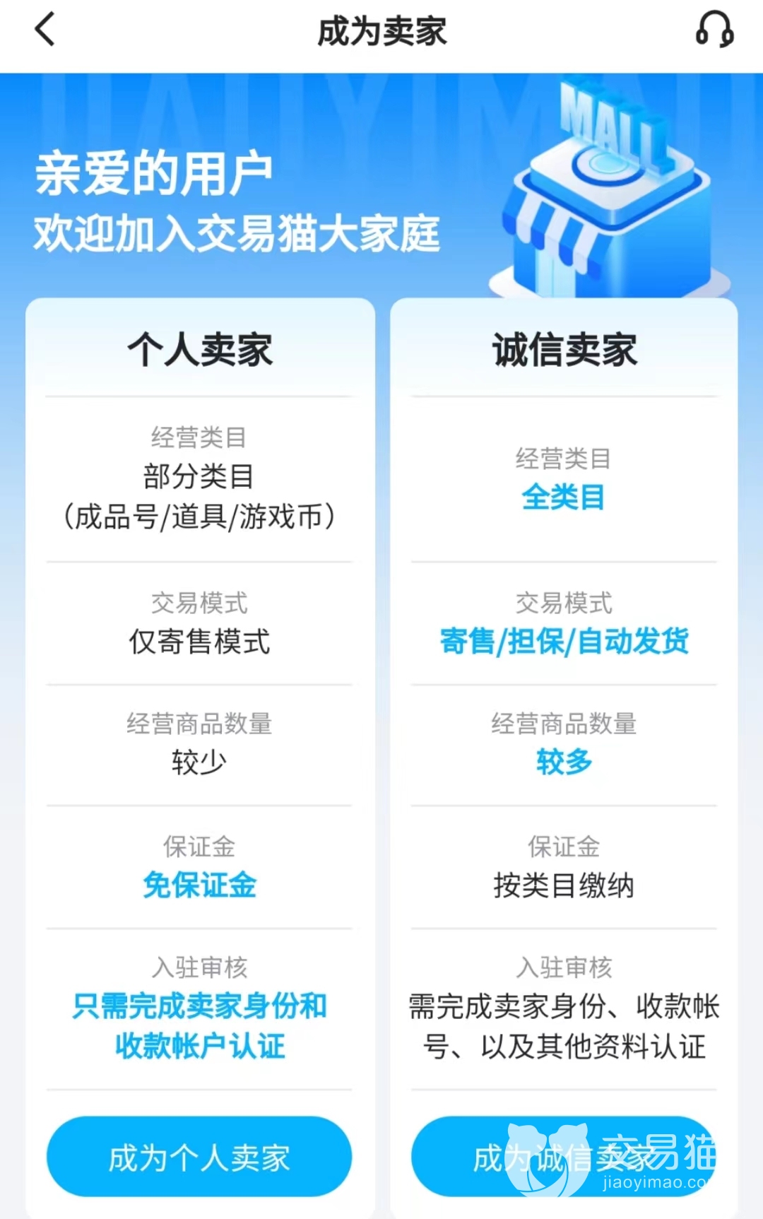 其一,支持卖家身份选择。从卖号流程一开始,交易猫就考虑到了卖方的情况,如果你只是来卖个别号,急需回血的效率和方便。那不需要多少认证,平台指定的个人卖家就可以帮你迅速解决需求。如果是有多个游戏的卖号需求,希望获得更加稳定,有竞争力的售价,那么诚信卖家会是你更好的选择,信息更详细,交易手段更多样,从卖的源头就帮你考虑完善,便是交易猫要做的。