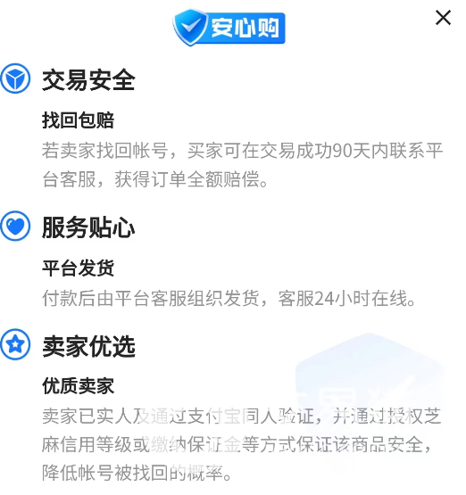 在部分商品下方会带有“安心购”的蓝色字体,这个安心购是由交易猫自理推出的保险服务,买到手之后自动生效,也不用再去支付额外的费用,因为是部分商品才带,所以一般都是信用比较良好的商家特权,账号买到手之后九十天内是可享受包赔服务的,避免出现七天乐的尴尬情况。