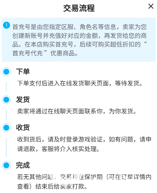 交易猫购买商品一点也不复杂,反倒是比小平台迅速的多,因为每一单交易都有客服来进行发货和服务,要想知道交易进行到哪一步的话,也可随时去问客服进度,大家要是想知道交易猫究竟是以何流程进行的话,在各个商品下方都可找到,首充号有首充号的流程,成品号也有成品号的流程。