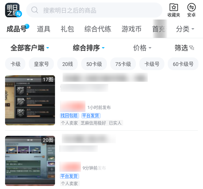 这也是很多小伙伴一直在使用的估值模式,直接自己去市场中查看其他商品的价格来进行比对和估算。在交易猫平台中带有大量的明日之后账号商品,而且种类比较齐全,成品、首充号都是有的。而且在商品列表界面的头像图片中就能够看到账号中带有的等级、角色职业以及道具等内容,方便我们进行估价。这里也告诉大家一个小技巧,通过搜素一些皮肤内容或者是游戏中的资源,就能够快速定位一些商品,还可以灵活使用右侧的筛选按钮哦。