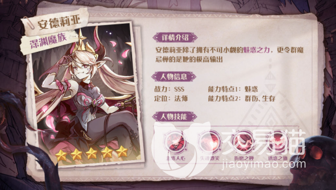 安德莉亚拥有四个不同的技能,一技能能够承受伤害并且恢复生命还能够提供角色的攻击力,这一个技能都能抵得过其他角色的三个技能了。二技能是输出技能但是也带上了不利于敌方的效果。三技能是被动技能,对于角色来说就是如虎添翼的存在,四技能也就是大招也是同样的。