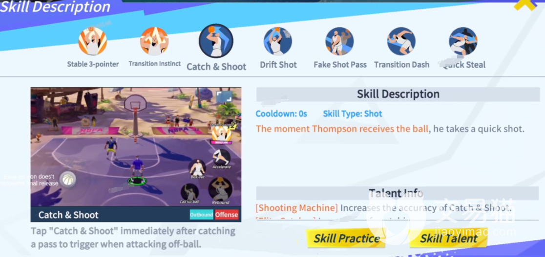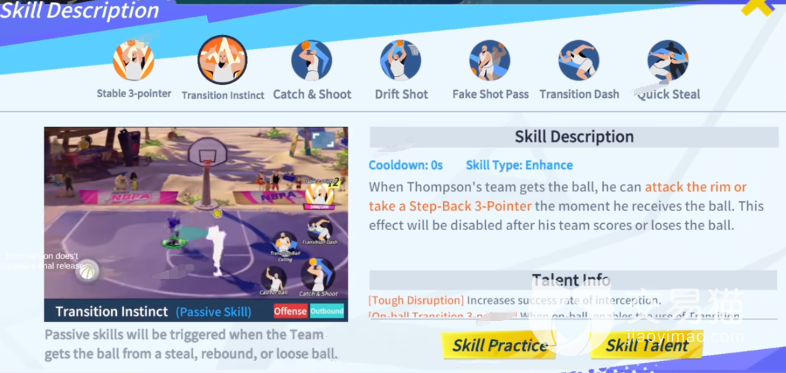 2、被动技能—反击大师:这个技能的效果会比较复杂,简单来说就是在攻防转换的过程中会进入一个全面强化的状态。其中除了各项数值的增幅外,还会派生出接球,顺下上篮和接球后撤三分。这里需要注意的一点是,这个技能只能在攻防转换的过程中触发。比如说放的二次进攻,那么是无法触发这个被动技能的。这个技能一共可以升级七次,一级的时候会赋予其防守时的栏截的成功率加成;二级的时候会拍成一个新的技能,在反击时可以在三分线内使用一个撤步三分;三级会增加后撤步三分的命中率;四级的时候会拍成一个新的技能;在空接上篮或者后撤三分的过程中将球传给队友;五级会减少传球被拦截的概率;六级的时候会派上一个新的单手抛投的中投花式;七级会派上一个新的三分球。