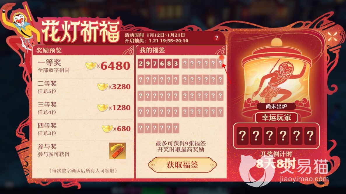 完成这系列步骤后,在大圣贺岁活动界面找到花灯祈福,选择“前去祈福”,点击红点就可以获得你的福签数字。就有点像是福利彩票,等21号公布的时候如果数字对得上,就能获得一些元宝奖励,最高一等奖可是有6480元宝呢!