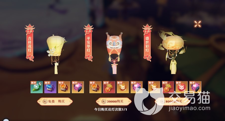 花灯分为三种,分别是:吉祥花灯、平安华灯、盛世彩灯,从免费到8万铜钱不等,私以为还是购买盛世彩灯性价比最高,有概率获得一级二级蜃珠、神铸令、摇光神石。铜钱还是很容易获取的,随便卖点符就可以得到好几百万。