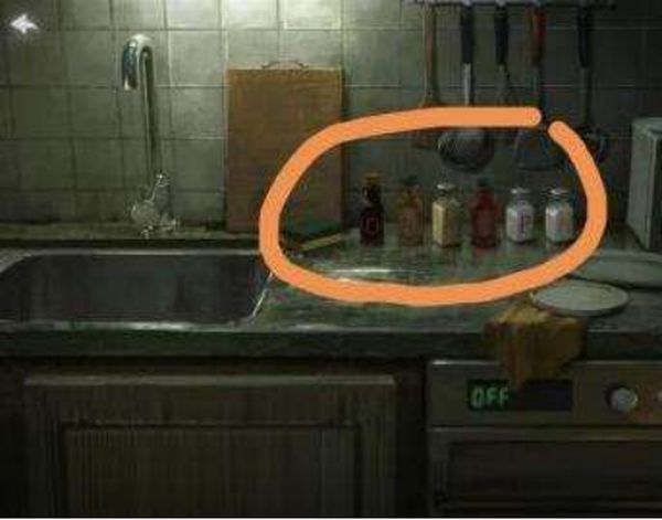 得到刀片之后,再用刀片把镜子上的黑胶带给拆开,里面有一个电池,记着把电池装到走廊的玩具小娃娃中,它就会发出光芒,身上还有字母,这个字母是厨房调味料的摆放顺序,按照字母顺序把调味料上的字母摆放一下,就能获得钳子了。接着再把脏碗放到洗衣机,再根据日记内容,在书房中获得钥匙线索,就完成这章的全部内容了.