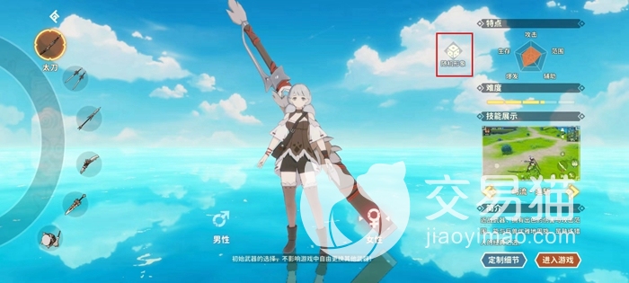 一开始进入游戏后,我们要先选择主角的性别和使用的武器。目前游戏可供武器有太刀、双手剑、战矛、回旋镖、巨剑、战鼓这几个。在页面右边会有武器的特点和技能展示,大家了解清楚后,再根据自己喜好来选择,不过武器进入游戏后还是可以更换了,大家也不用太担心选得不好。