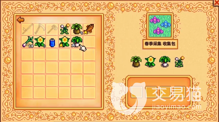 2、第二个包有三种选择,第一种是工艺室的建筑收集包,这个只要升级了爷子下过矿就能开。第二个是茶水间春季作物收集包,可以开局第一天就种上那作物,这样的话13号就可以完成了,也就是说可以在5号以后再种。第三个选择是鱼缸的蟹笼包,运气好杀岩石蟹掉出螃蟹能够掉落,当然也可以在沙滩通过捡鸟给、蚌、牡蛎弄,但是这个方法比较的看脸。