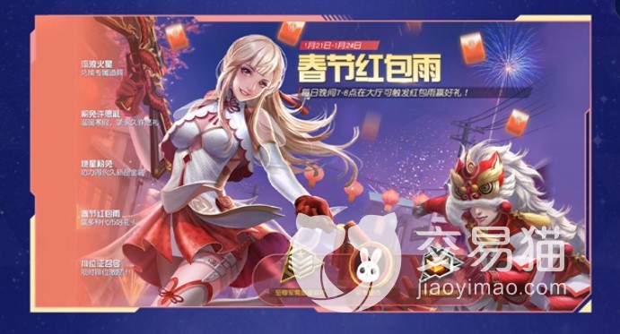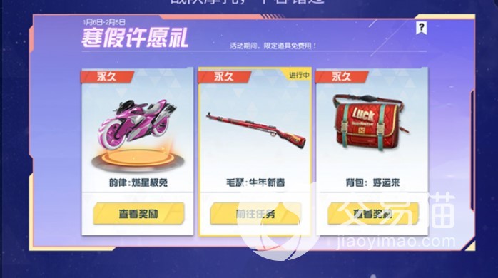 新春版本活动现在已正式开启,截止2月5日,大奖是限定金品燃星极兔系列套装。活动期间3选1许愿礼,完成相应的任务就可以永久获得该道具。极兔车、毛瑟枪、好运来背包,你喜欢哪一款呢?