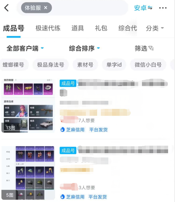 账号方面,像是和平精英体验服的账号,平台会把它收录在和平精英专区,专区内拥有非常多的该游戏账号,不止体验服账号更有大神号、皮肤号、成品号等等账号,平台对这些账号都进行了标记,在账号介绍前会有介绍,这些标记可以让大家对这些账号有一个直观的观看体验。