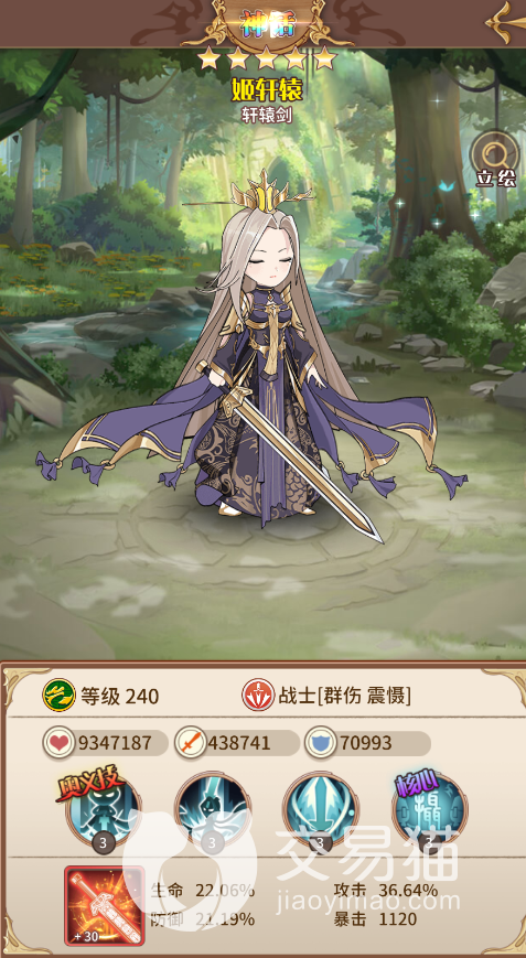 她的职业是战士,是一个群伤类型的角色,其技能“天决”可以在敌方半场造成极大的物理伤害,且有一定的几率可以附加让人无法移动的震慑效果且持续3秒,除此之外,她的奥义技“剑指山河”还可以直接对敌方所有敌人造成自己270%的高额物理伤害,并将没有自己攻击力高的目标进行击倒,如果奥义技升到了第三级的话,除了攻击力提升以外,还可以给敌人添加一个3秒的增伤效果。