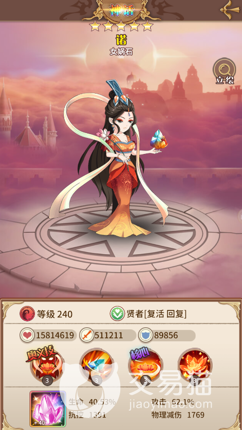 这个角色也被大家成为“女娲”,她是一个治疗型的角色,其技能“练石”可以对她正在攻击的目标以及目标周围的敌人,造成高达348%的大范围魔法伤害,并且每命中一个目标都可以给自己回复7%的血量,其奥义技“魂兮归来”还可以让自己已阵亡的队友们随机复活一个,并为复活的队友回复一定的血量,如果在使用这个技能时没有队友阵亡,那么她还会给全体队友回复一次血量。