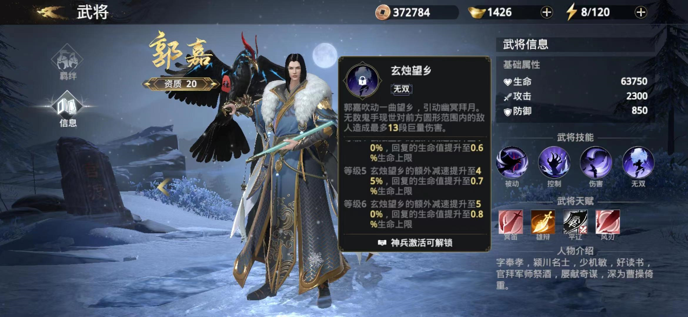 最后郭嘉获取难度最高,完全是氪金玩家的专属,但是后期可以提升到22点资质,属于游戏中最强力的一名。在开启无双技能后可以伤害范围内的敌人并且额外回复生命值,相当于自己拥有了很好的吸血效果,这样完全可以在团战中立于不败之地,虽然自身比较脆但是依靠恐怖的吸血完全不用怕被秒掉。