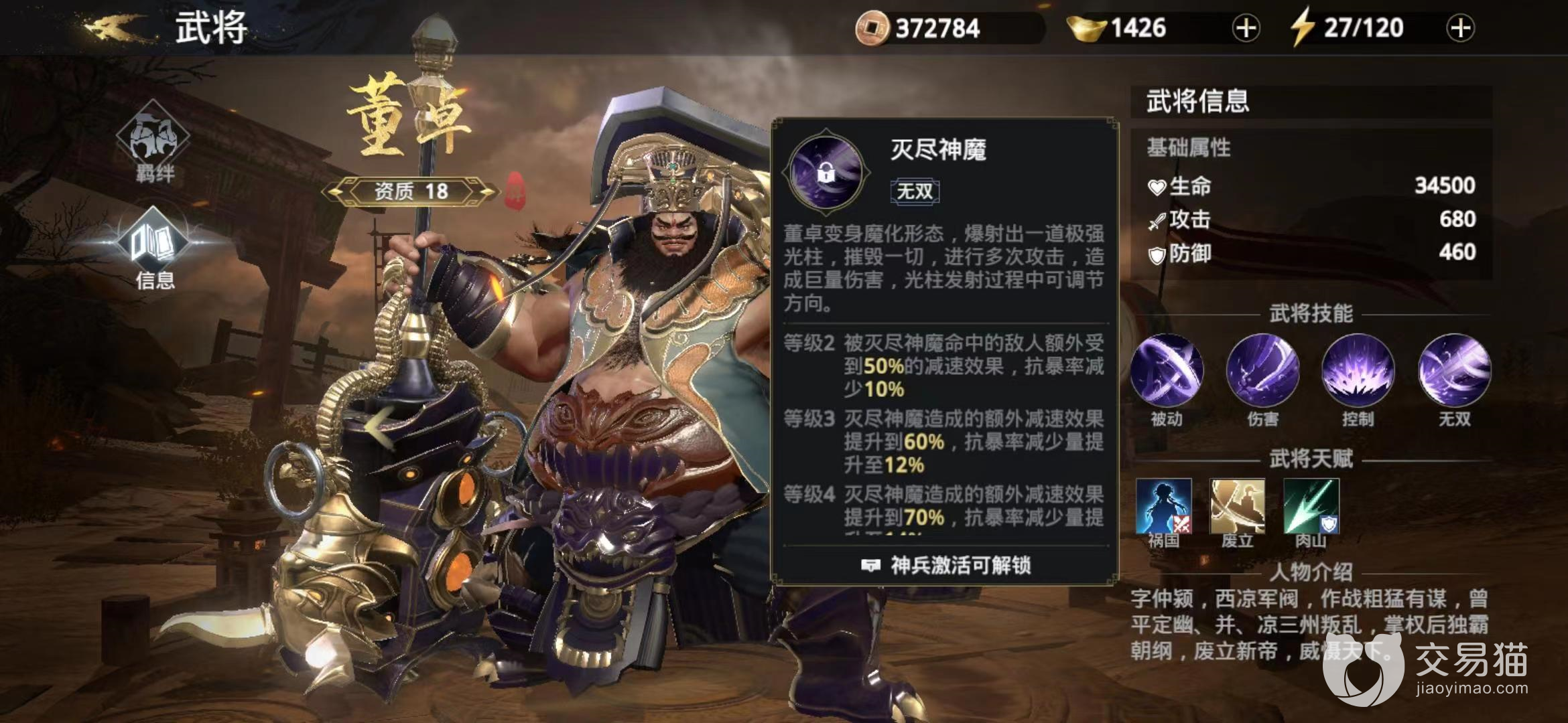 董卓同样属于获取起来比较简单的武将,虽然很多玩家感觉他比较拉垮,但是在综合养成方面绝对占据一席之地。开启无双技能之后可以化身为魔化形态,发射出一道光柱摧毁一切敌人,可以对范围内造成多次巨量伤害。并且还能够通过控制光柱的方向打击不同位置的敌人,在使用的时候可以多练习几次,就能将技能伤害最大化。而且对于平民玩家来说,想要培养董卓可以去招募或者是参加各种活动就能获得碎片。
