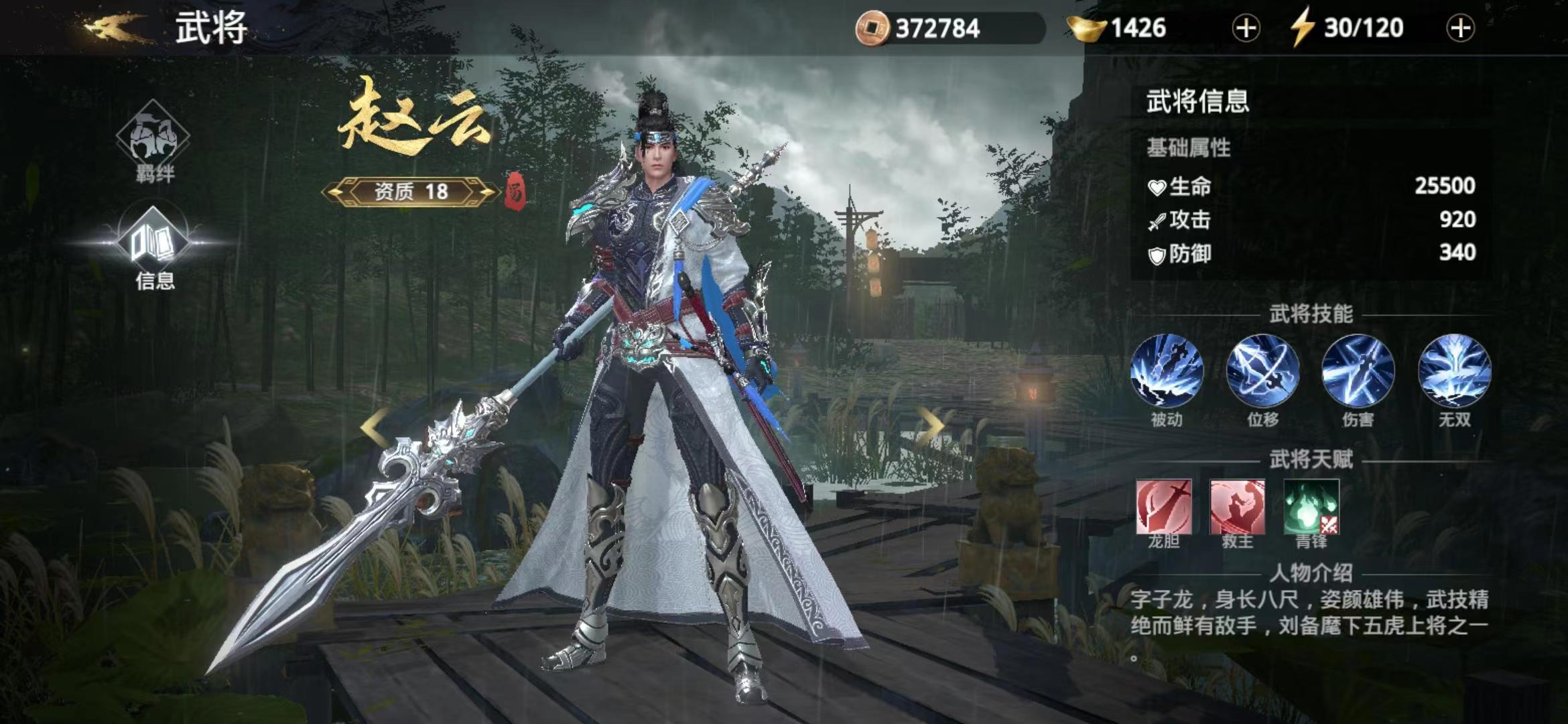 夏侯敦是小编非常喜欢的午武将,也是现在很多玩家手中的第1人选,不仅因为他可以提升资质,即使在初期阶段也能够使用自己的大招带来非常可观的伤害。后期可以通过活动兑换到金将碎片获得实力上的巨大提升。即使刚获取夏侯惇时培养不到位无法出战,也能够利用被动的提高百分比格挡效果为团队带来贡献。赵云最大的特点是拥有非常好用的位移技能,这一点在刷图时获取不明显,但是在PK中能够打出非常炫酷的操作。再加上无双技能伤害非常高,在团战的时候,也有很多其他武将所没有的优势。后期同样和夏侯惇一起利用收集到的碎片提升资质,再次获得一次强化。