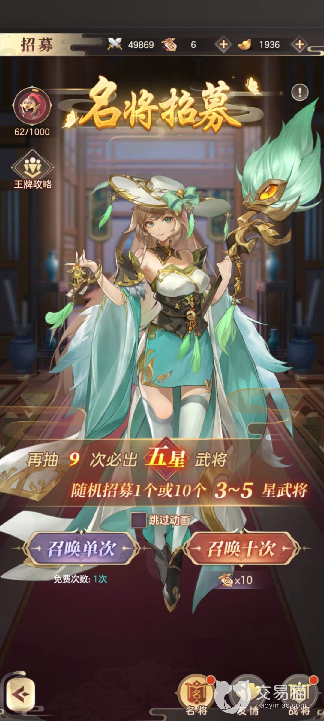 要想获得名将或是其他顶级武将,最关键的依然是抽卡,在这款游戏中需要大家去主城的点将台,其中有三个选项,分别是名将,友情和战将,而我们需要进行的就是名将招募。需要消耗名将册,抽取有一定的几率,每抽一次直接获得5星武将的几率在0.4%左右。如果进行的是10连抽还有保底几率,尤其是第1次抽取10次必定会出现一个5星武将。