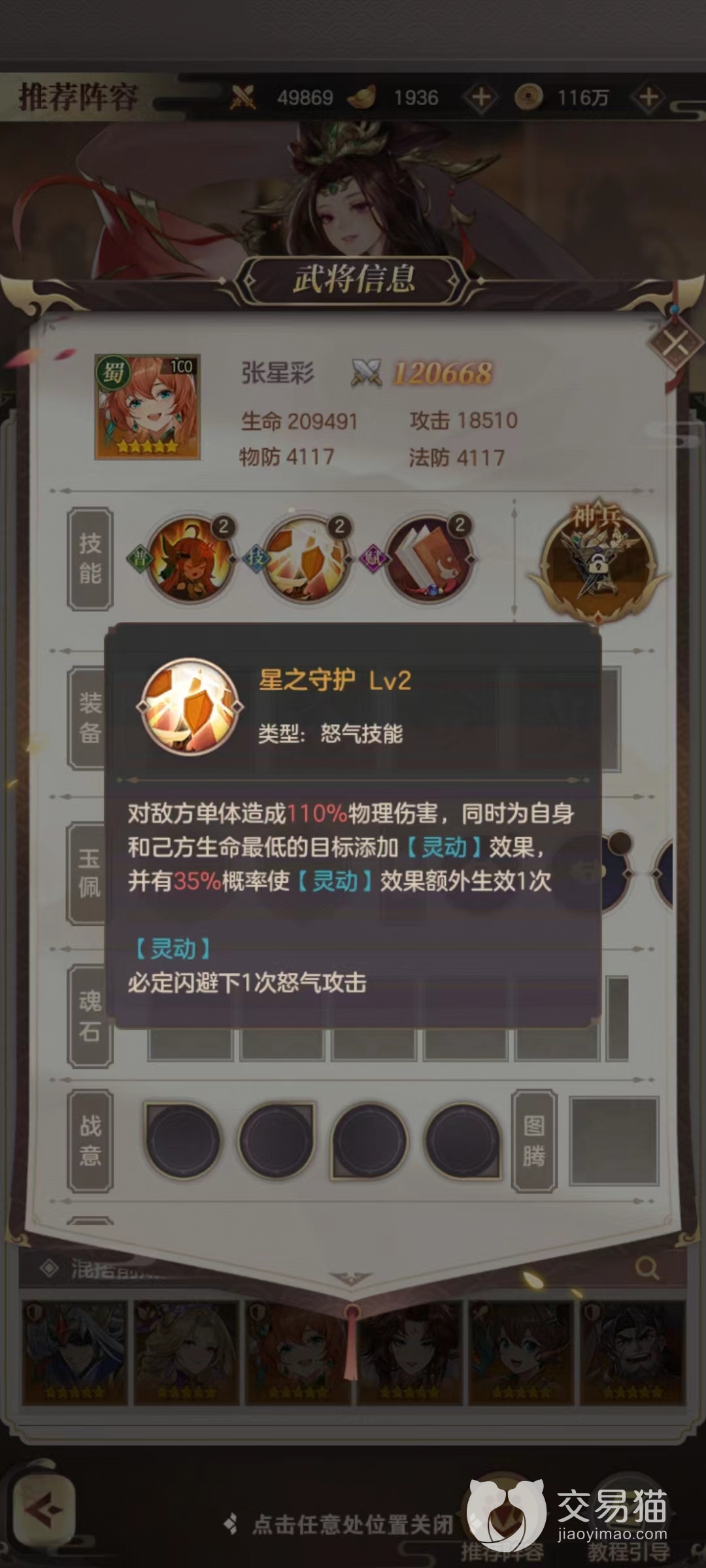 而张星彩则是作为肉盾出现,利用技能星之守护在对敌方造成物理伤害的同时,选择己方血量最低的一个目标和自身添加灵动效果。被灵动所保护的目标,必定会闪避下一次受到的敌方大招显著提高了生存能力。再加上自身的普攻可以提高闪避几率,所以可以在前排吸收很多伤害。黄月英的主要作用是为己方的输出提供辅助,普攻可以降低对方的防御,大招可以降低受到治疗的效果,都是很好用的攻击型辅助状态。