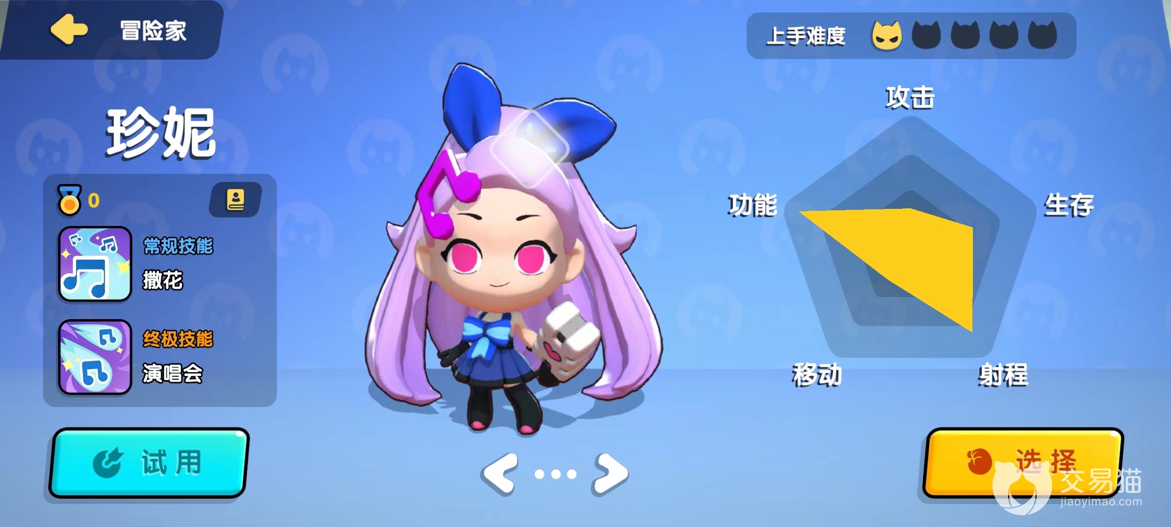 珍妮是游戏目前唯一的辅助冒险家,可以治疗队友。它的常规技能“撒花”,发射一波音浪,对敌人造成伤害,同时对队友进行治疗。终极技能“演唱会”,以自身为范围造成持续音波攻击,对敌人造成伤害,对队友进行治疗,期间为自己减伤和加速。珍妮的上手难度不高,要注意的是它生命值比较低,在战斗时要注意走位。