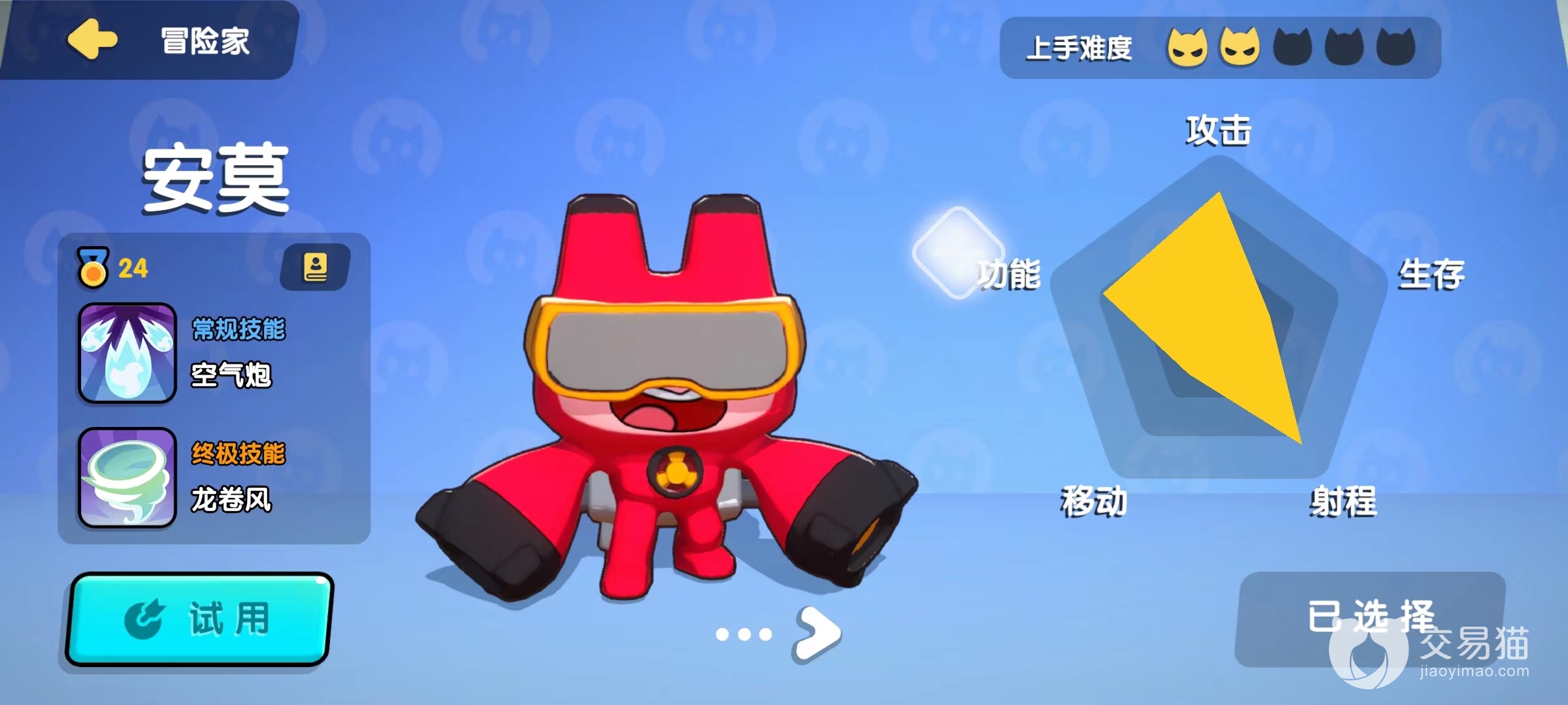 安莫是一个很适合新手的冒险家角色,上手难度不高。它的常规技能“空气炮”,向同一方向连续发出6发空气炮,是一个长方形的攻击范围,很容易击中敌人。终极技能“龙卷风”,发出两道空气炮,碰撞产生一道将敌人击飞的狂暴龙卷风,这个技能要稍微注意一下释放的时机。