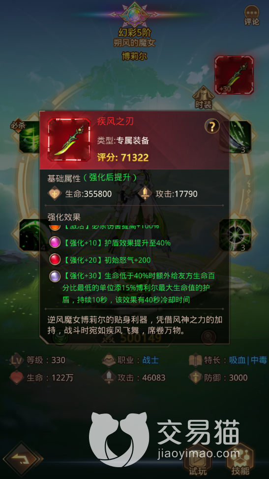 博莉尔的话则是比前者只强不弱,她的必杀能够对目标造成巨额伤害并提供100%的吸血,而且装备特效能够提供怒气与护盾,从而保证开局施放必杀,另外装备在强化满级后,还能为友方血量最低的目标提供相当于自身15%最大生命值的护盾,可以说无论是输出,防御还是保护能力都拉满了。