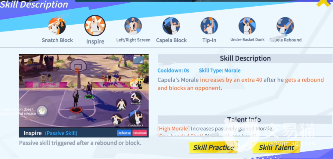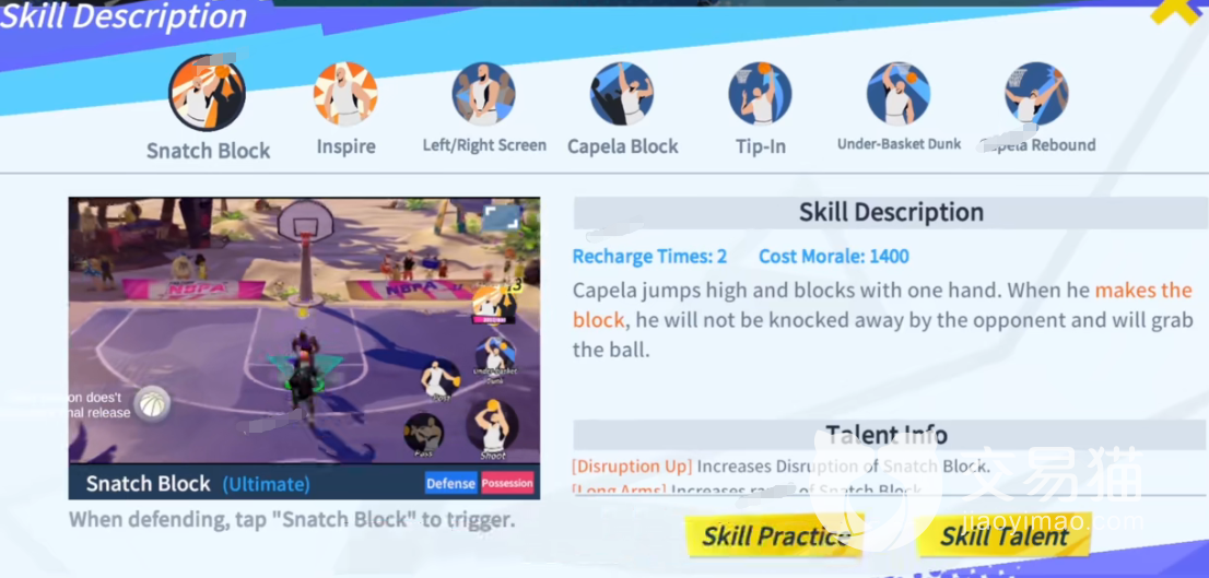 1、主动技能—抓帽:所需能量1400点,可以进行两次充能,高高跃起无视击倒将篮球收入怀中,技能可以升级五次。一级增加技能的干扰效果;二级增加技能的有效范围;三级额外增加1米的抓帽有效范围;四级后如果没有成功抓帽,返还部分能量;五级时会派生一个全新的技能效果,可以对上篮或者扣篮动作进行追冒。