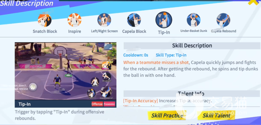 5、补篮:一级增加补篮的命中率;二级增加技能的触发范围;三级在普兰时会有额外的篮板能力值增幅。