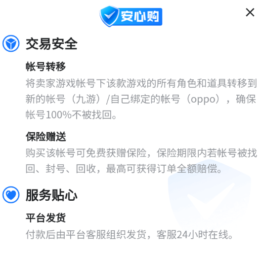 一些小伙伴可能会担心买号的安全性,因此交易猫专门推出了“安心购”服务用于保障交易安全,其中部分商品所提供的“找回包赔”和“保险赠送”服务都能对账号起到一定保障,然后部分端口还会支持账号转移,此类商品可实现将卖家账号数据直接转移到买家账号,从而节省交易时间,同时大大降低风险。