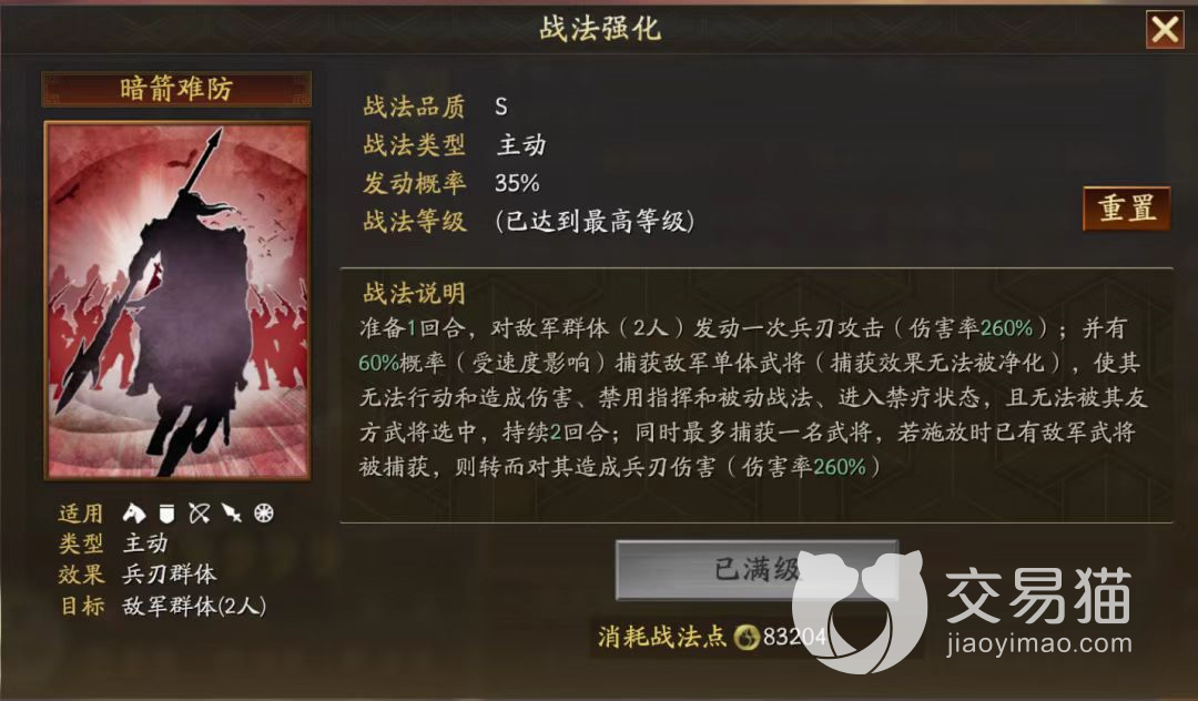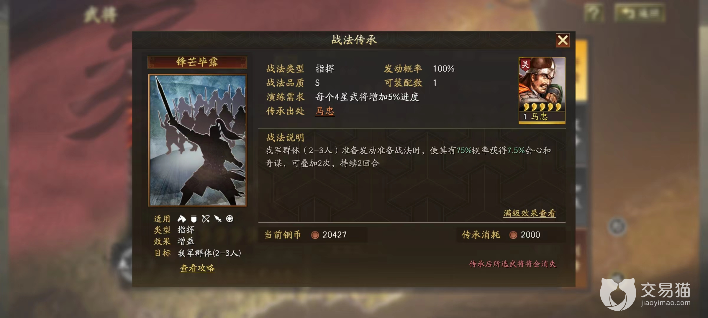 马忠的暗箭难防拥有一个全新的捕获效果,在控制上可以完全控制一名敌方武将,使其无法进行任何行动,比其他很多控制效果都要全面。并且还将附加群体伤害效果再造成伤害后,还能对被捕获得敌军追加一次伤害。这样能够全方位将敌方限制度的技能,如果能够善加利用,将会带来非常好的效果,甚至可以逆转乾坤,所以小编非常看好马忠在新剧本中的表现。他的传承战法锋芒毕露,可以对群体进行增益,非常适合搭配一些战法中带有准备效果的武将,可以其提升奇谋和会心属性,而且发动准备战法的次数越多,最后所叠加的增益效果也就越明显。