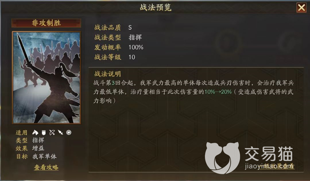 非攻制胜属于S品质的指挥战法效果,是在第3回合开始,我方武力值最高的单体武将造成订刃伤害时,可以为兵力最低的单体进行治疗。这一个战法设计非常巧妙,让输出型武将也具有了续航的能力,这对于现在很多出场率比较低的武将来说是一条新的路线可以走得更远。