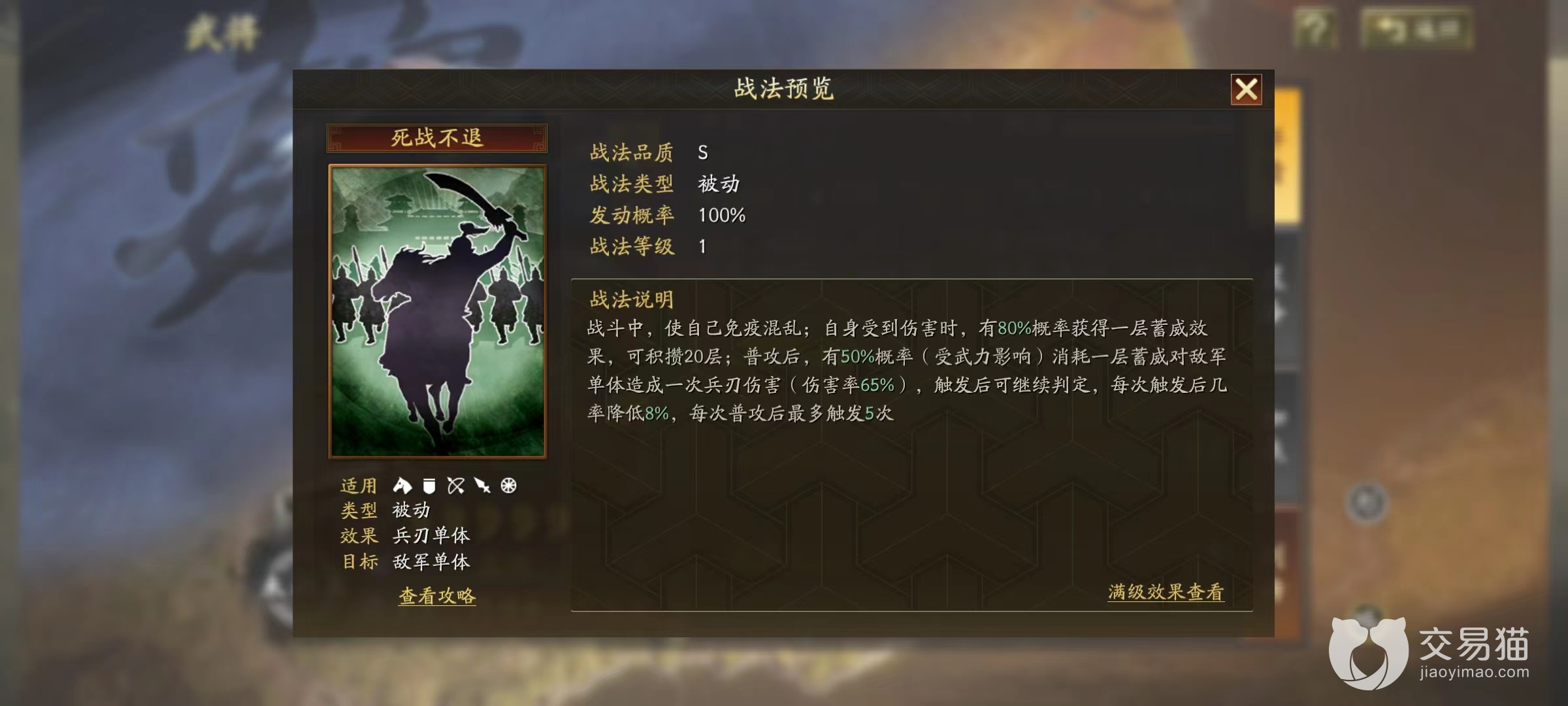 SP庞德自带战法死战不退,属于S品质的被动战法,主要有两个效果。第1个是在战斗中使庞德不受到混乱影响,第2个是在受到伤害时可以叠加层数,并且利用普攻消耗掉层数,附加一次额外伤害可以连续触发。这一技能的发力期在战斗后期,前期需要适当承受伤害叠加起来,但是兵力损失不要太多,后面才是真正发挥的时候,可以起到力挽狂澜的效果。此外,SP庞德和SP关羽还将获得传承战法忠勇毅烈,能够提高主动战法的发动几率和属性以及获得倒戈效果,非常适合持续作战型的武将。