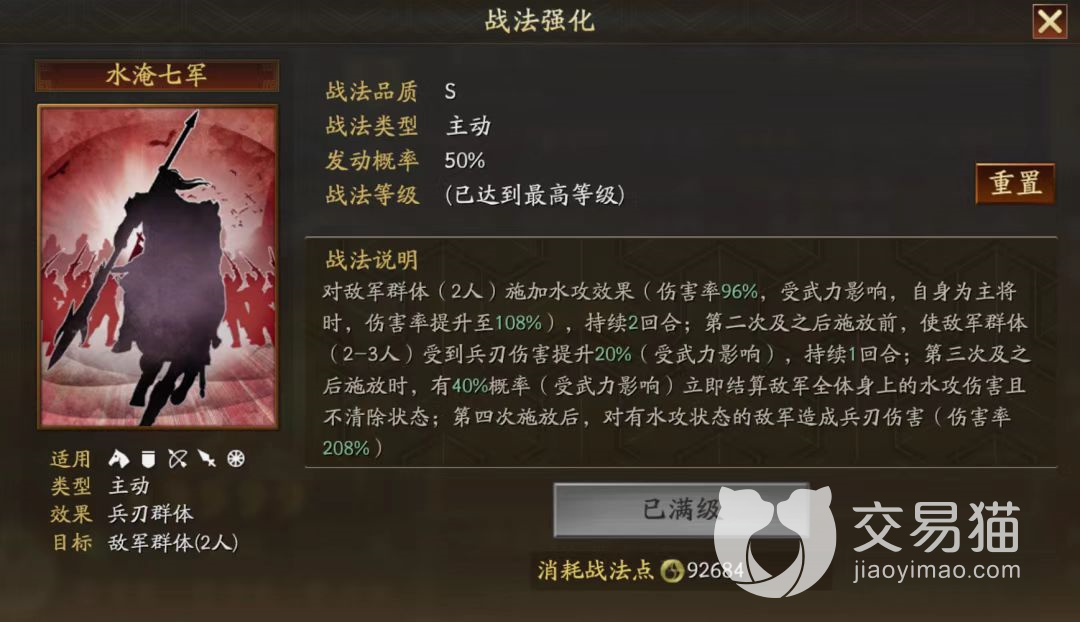此次出现的新技能主要有 SP关羽的水淹七军,SP庞德的死战不退,和马忠的自带战法暗箭难防,传承战法锋芒毕露,还有事件战法非攻制胜。接下来小编将对这些新出现的战法详细介绍一下。水淹七军属于S品质的主动战法,最大的特点是随着发动次数的提高所带来的效果和伤害也逐步提升。为敌方两名武将施加水攻状态,被影响的目标将会受到持续性伤害,当持续多次释放受到的兵刃伤害将大幅提升。此外还将附加有立即结算效果,这里要介绍一下立即结算,是将后续所有应该受到的伤害全部爆发出来,但是状态却并不取消。