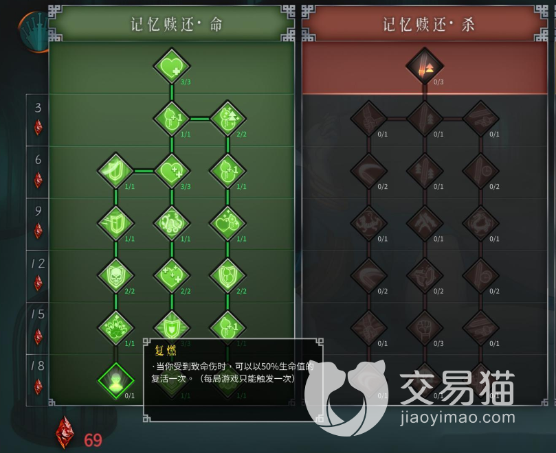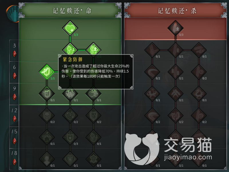 在前期我们要加点的地方一定是“记忆赎还·命”,也就是绿色的天赋,特别是一个叫做“紧急防御”的,这个点了以后,当我们在遇到高于我们生命上限25%的攻击时,会自动降低70%的伤害,不过需要2分钟才能触发一次,所以我们也要及时规避伤害。