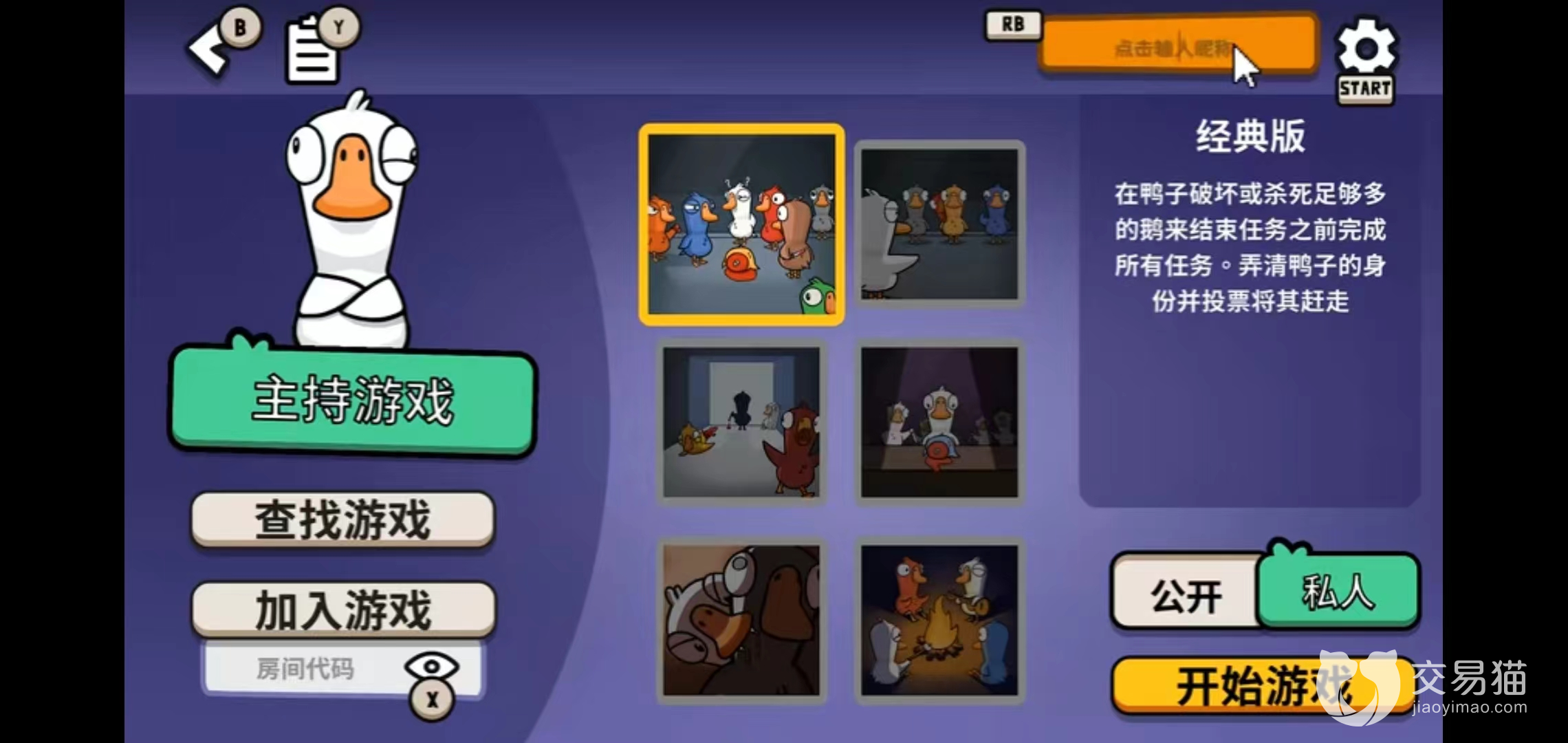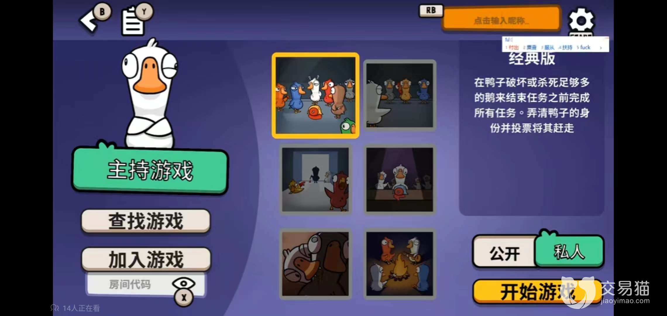 输入好名字之后,就可以点击查找游戏,可以看到里面有不同的房间,不同的模式,不同的地图,地图这个一般都是地下室的比较多,状态显示已有的人数和最大人数。选择好想加入的房间就可以开始游戏了,会看鹅的图标在不停地运转了。如果发现已经满员了,需要重来。