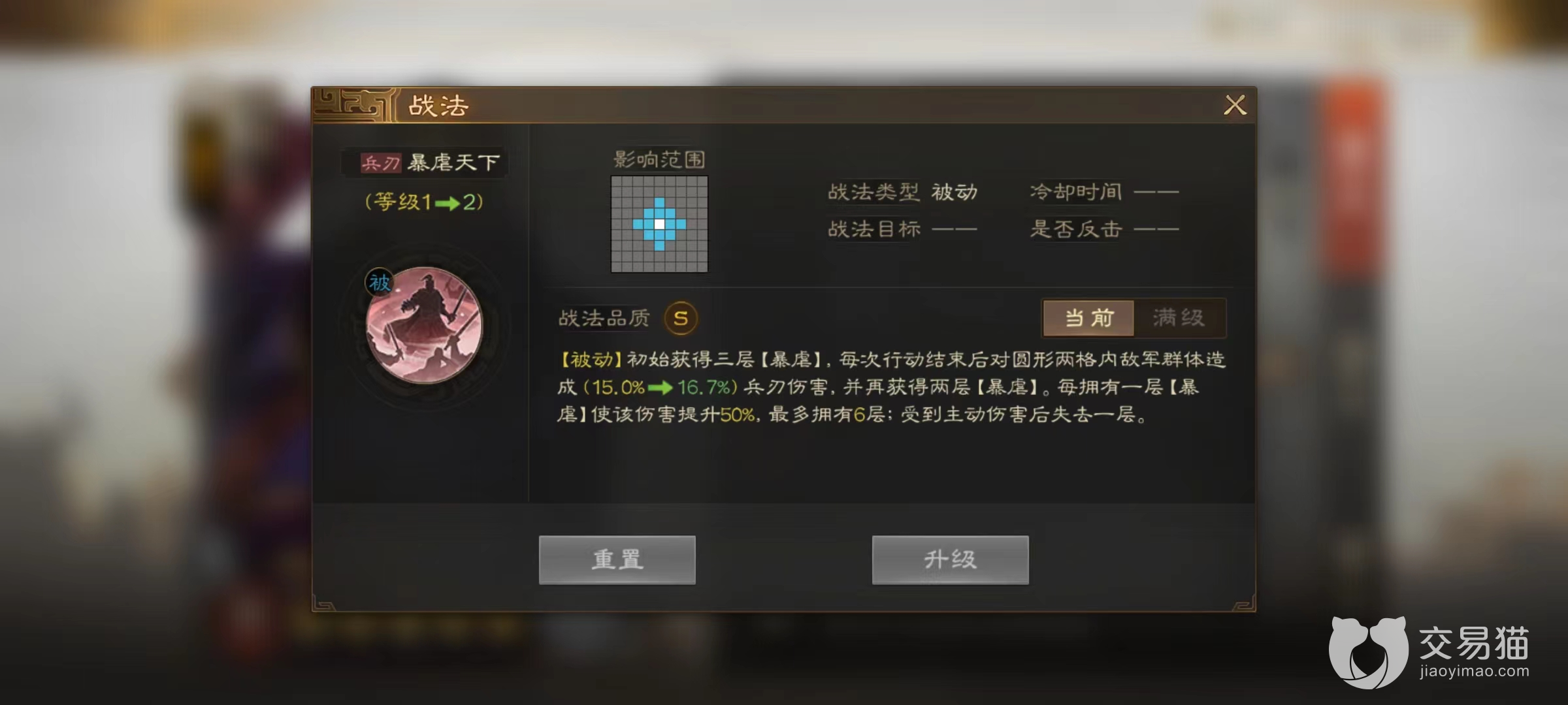 再看一下自带的被动战法暴虐天下,在战斗初始阶段自身就可以获得三层的暴虐效果,每次行动结束后对两个范围内的敌军群体造成一次额外的兵刃伤害,并且再获得两层的暴虐状态。暴虐对董卓有很高的加成,每拥有一层效果就能使得该伤害提高50%,最多能够叠加到6层,一旦董卓受到主动伤害会失去一层。当暴虐层数叠加起来之后,依靠董卓超高的武力值完全可以成为队伍中非常重要的输出点。