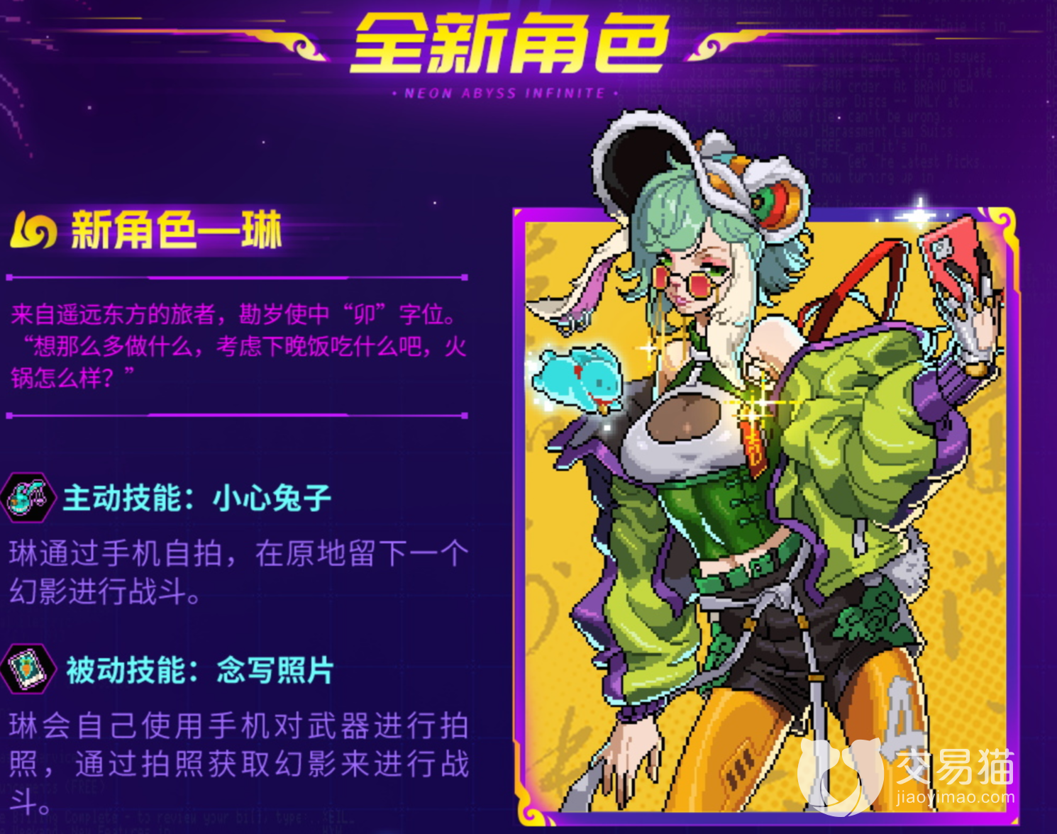 该角色的设定是东方的旅行者,所以设计的很有东方韵味,包括十二生肖的卯兔和舞狮头都能看出这个角色非常有特色,并且混搭赛博风格的潮流服饰保留了游戏的特色,从海报当中给人的第一印象还是很不错,不过游戏当中的具体样貌还没有给出,所以也就看不出舞蹈动作和其他的攻击动作了。