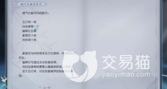 一个化紫丹需要玩家们使用一枚五行珠、一个四品兽骨、五颗幽冥石、十支紫猴花一家十支伴妖草,这些材料可以在多个场景内手机,紫猴花和宝药草一般都是在红枫林内采集,幽冥石、五行珠可以在击杀妖兽的时候获取,四品兽骨可以在魔狼族群的身体上获取。