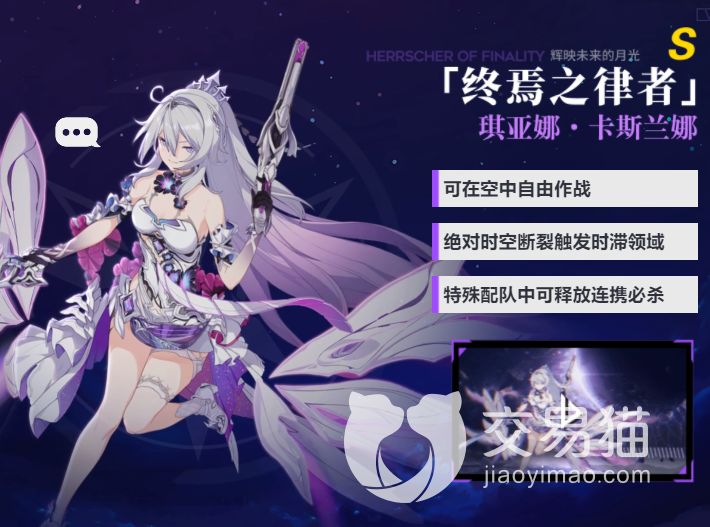 终焉之律者是琪亚娜的全新律者形态,这次在外形上和之前的薪炎之律者有一丢丢类似之处,比如都是长长的单马尾,但在身上的装饰上明显有了代表终焉的元素,比如纯白色的铠甲和头发上,点缀着黑紫色的装饰,据官方的说法这代表了终焉之力的一体两面。搭配瞳孔中的粉紫色星辰,形成了一种带有神性和人性并存的整体质感。