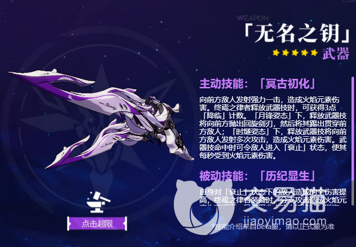 在推荐武器方面,目前推荐的是无名之钥双枪,带有枪剑两种属性,主动技能可以放出强力的手炮攻击,造成火属性伤害,然后可以不断积攒能量。在不同姿态下,分别会触发剑性质回旋攻击,以及枪性质的乱射攻击,附加额外的持续火属性伤害,因为冷却时间也很快,操作手感流畅。超限后变成的无名之境:万物资始除了数值提升外,在与终焉之律者的时停领域联动下,还能造成额外的易伤效果,让角色打出输出更爆炸。