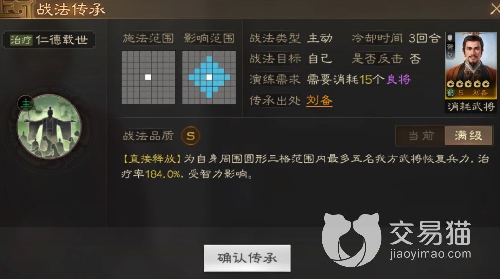 传承战法“仁德载世”,7×7的大十字范围,强大的恢复类技能,可以对自身三格范围内的最多5个己方将领释放恢复其兵力,技能提升会提高治疗率。从这两个战法来看刘备是盾与奶功能二合一,自身坦度不差同时还有可观的治疗技。3回合的冷却也不算长。除了自带的战法外比较推荐携带的战法有飞鸿羽翼、节烈多谋、乐善好施。被动可以用刮骨疗毒、简亮这类恢复向的技能。